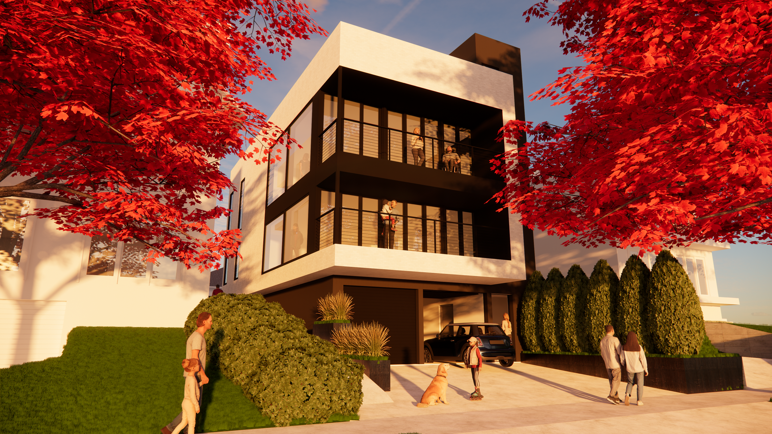 Sustainable rowhomes offering storefronts, rooftop decks, single and multi-family housing, ADUs, and parking solutions.